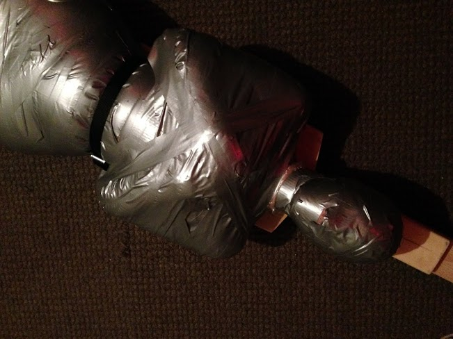 I am sitting here with a black-and-white duct tape covered body by my feet. From knees down it’s clad prettily in lacy stalkings. It’s collared, a lead reverently placed down the center of its body, head encased in a full hood with blindfold. Jazz plays, and the smells of Copal and burnt Mugwort fill the air. My coffee has been made perfectly. It’s peaceful here, and I’m bound to this helpless body, just as they are surely bound to me.